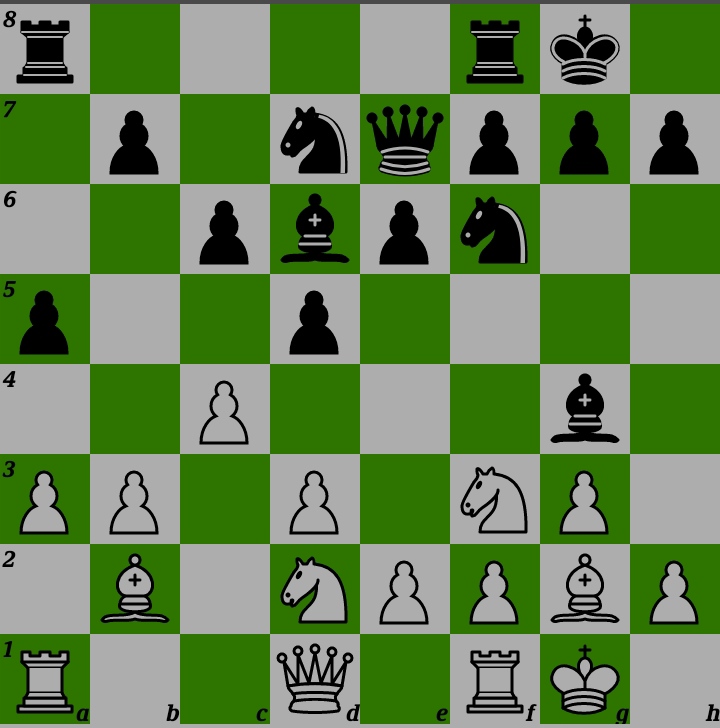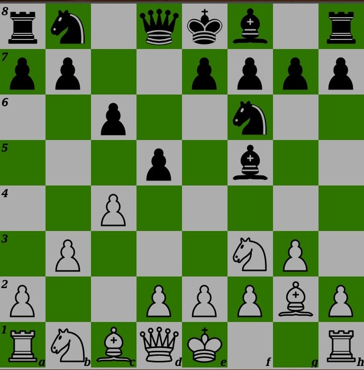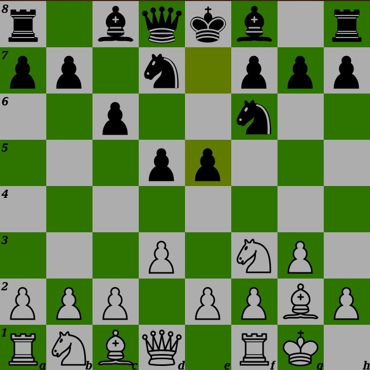 This position is characterized by the fact that Black’s queen bishop operates outside the pawn chain (alternatively it could also stand on g4). Black will put his e-pawn on e6 for the time being and only later try to push it to e5.